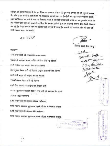 शिकायत की प्रतिलिपि प्रधानमंत्री नरेंद्र मोदी, केंद्रीय गृह मंत्री अमित शाह, भाजपा राष्ट्रीय अध्यक्ष जेपी नड्डा, राष्ट्रीय सह संगठन मंत्री शिवप्रकाश, छत्तीसगढ़ भाजपा अध्यक्ष किरण देव और प्रदेश संगठन मंत्री पवन साय को भी भेजी गई है।
