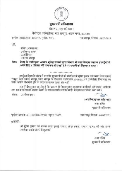 मुख्यमंत्री सचिवालय ने मामले को गंभीर मानते हुए ऊर्जा विभाग के सचिव को आवश्यक कार्यवाही हेतु निर्देशित किया है। यह शिकायत और मुख्यमंत्री सचिवालय द्वारा भेजे गए पत्र की कॉपी अब सोशल मीडिया पर तेजी से वायरल हो रही है, जिससे राजनीतिक गलियारों में हलचल तेज हो गई है।